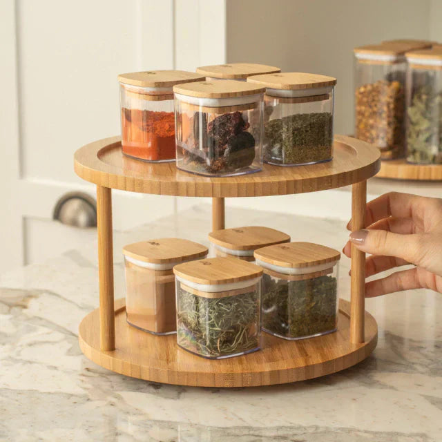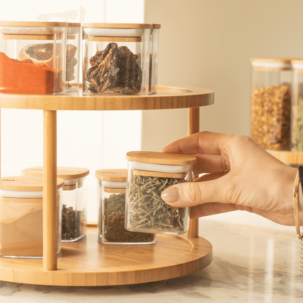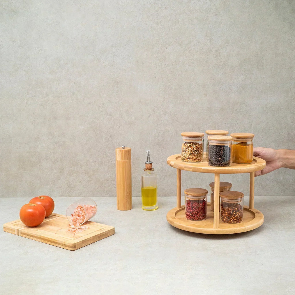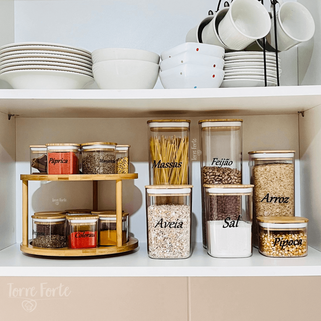 Kit Organizador Giratório + 10 Potes Herméticos em Vidro 300ml C/ tampa de bambu +50 Adesivos de Temperos