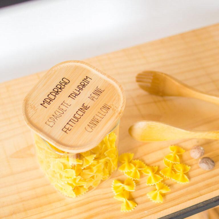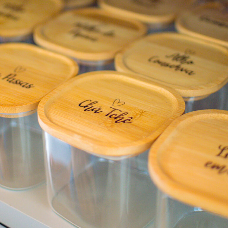 Os Potes Herméticos de vidro e tampa em madeira personalizada são ideais para guardar macarrão, arroz, feijão, farinha, achocolatado em pó e outros alimentos. Vedação com silicone e não entra ar, protegendo o alimento corretamente, fazendo durar mais tempo. Sua cozinha vai ficar ainda mais linda e prática.